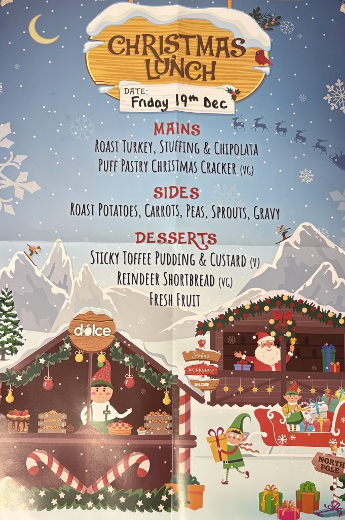 - Desserts: Sticky Toffee Pudding & Custard (V), Reindeer Shortbread (VG), Fresh Fruit