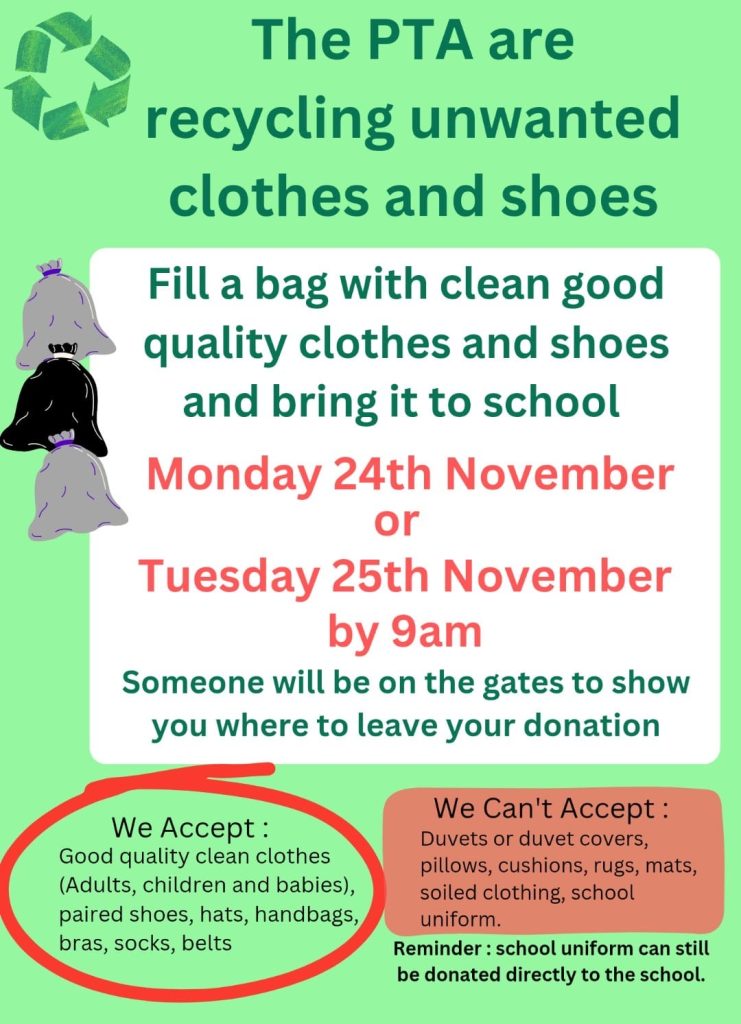 We’re excited to announce that the PTA is organizing a recycling collection for unwanted clothes and shoes. This is a fantastic way to clear out your wardrobes, support the school, and help the environment—all at the same time!