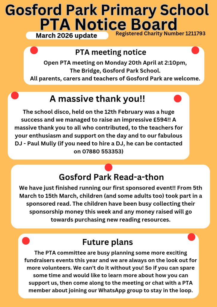 It has been a busy and rewarding start to the year at Gosford Park Primary! Our PTA has been working hard behind the scenes to support our students, and we have some fantastic updates to share from our most recent March notice board.