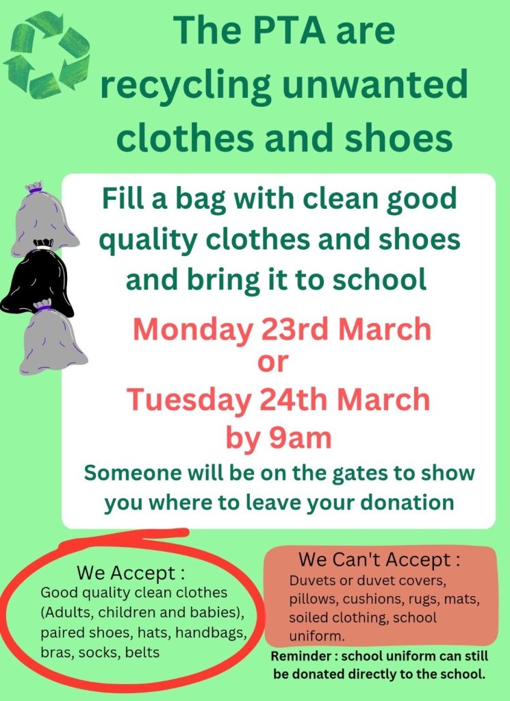It’s time to clear out those closets for a great cause! The PTA is organizing a recycling collection for unwanted clothes and shoes, and we need your help to make it a success.